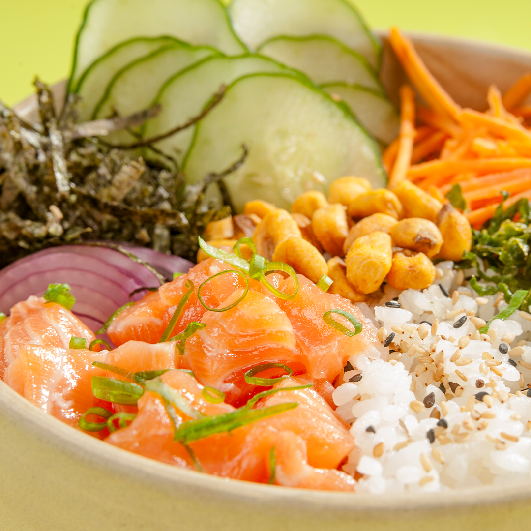 Gohan (arroz japonês), Salmão fresco em cubos, milho torrado, crispy de couve, nori, pepino, cenoura ralada, cebola roxa, cebolinha, gergelim. Acompanha Molho Shoyu. 💚